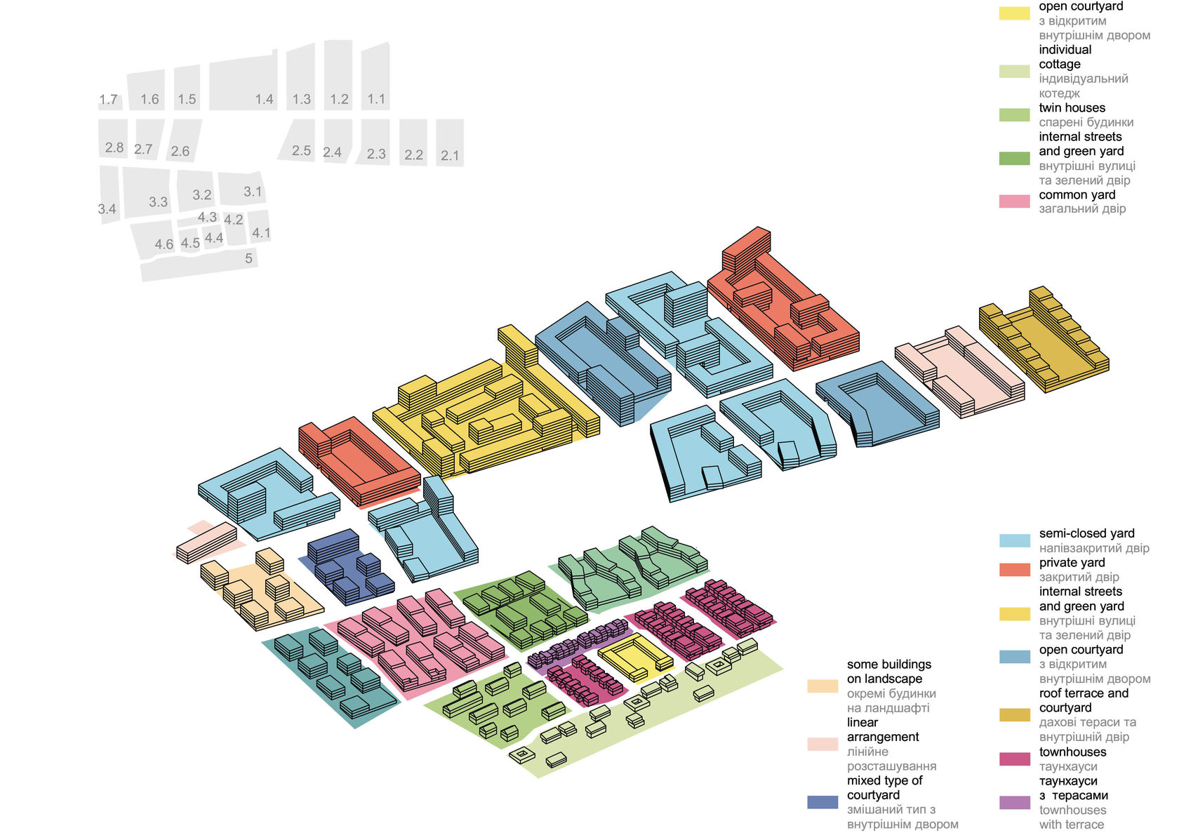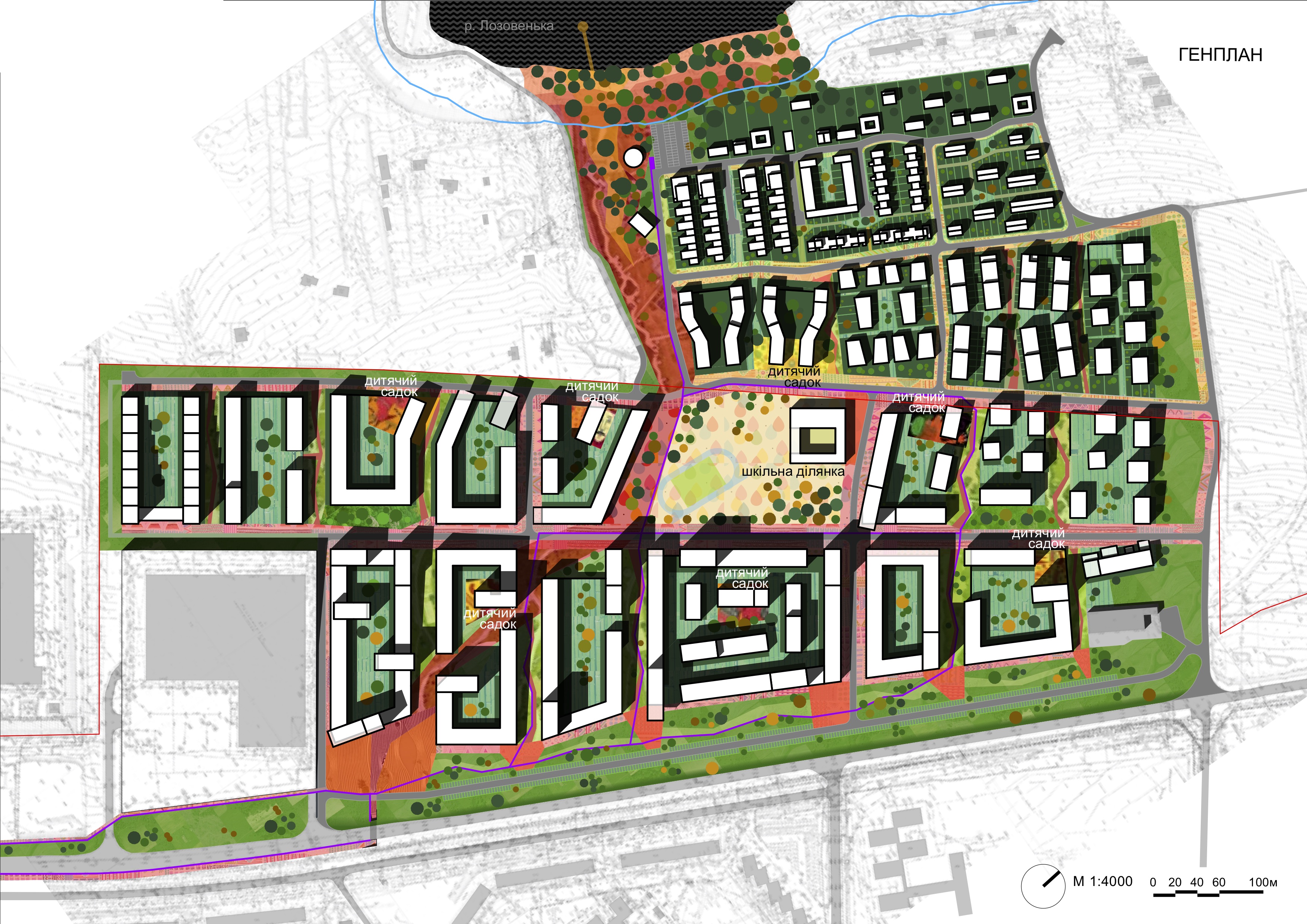 Озеро з природним оточенням як найважливіший атрактор.Використовуючи падіння рельєфу забезпечуємо максимальне розкриття з квартир та території в природу.