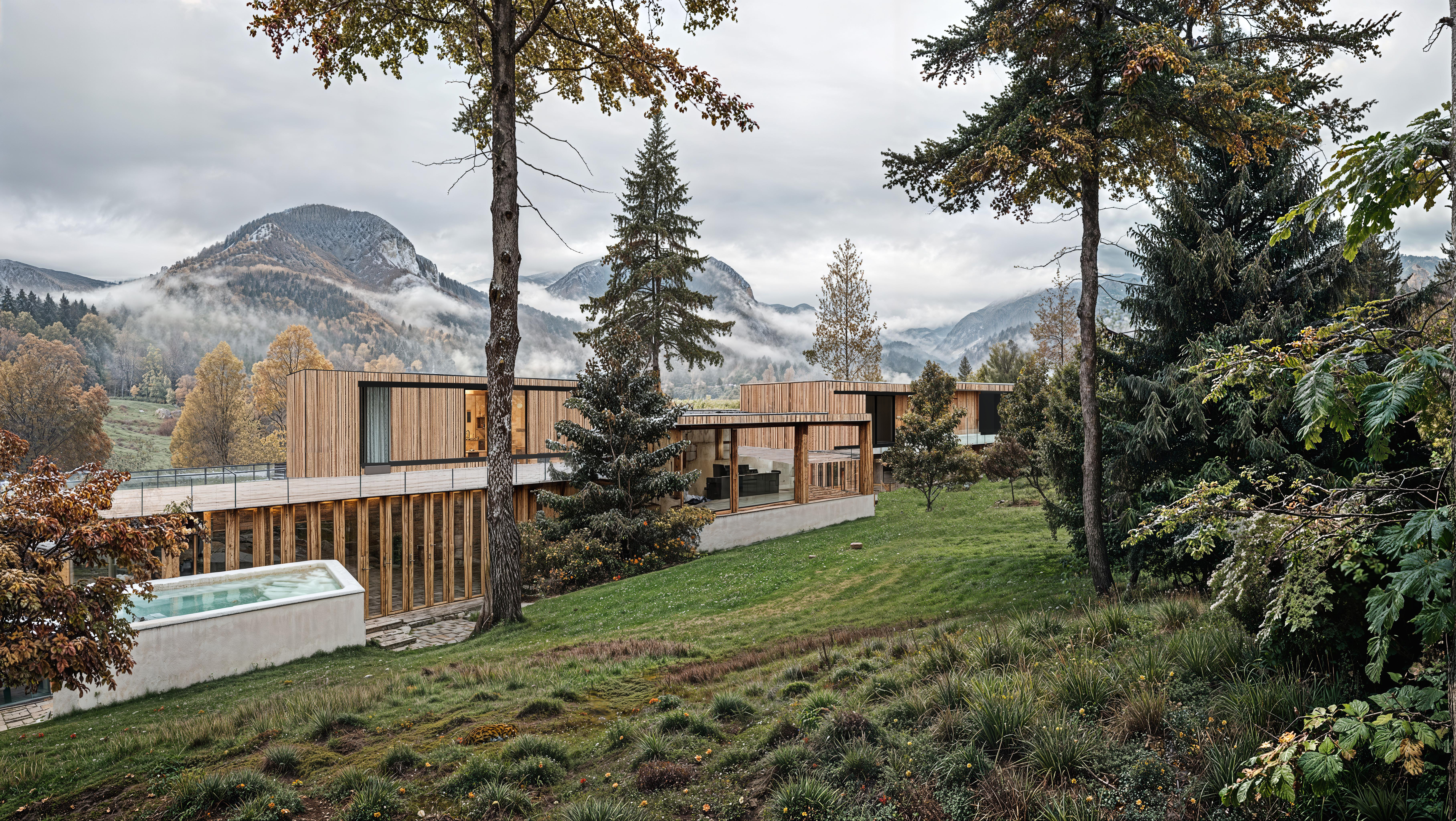 Форма будівель вторинна щодо горизонту. Вони читаються як продовження схилу, а фасади — як система повторень, що відгукується на ритм дерев та каміння в річці.