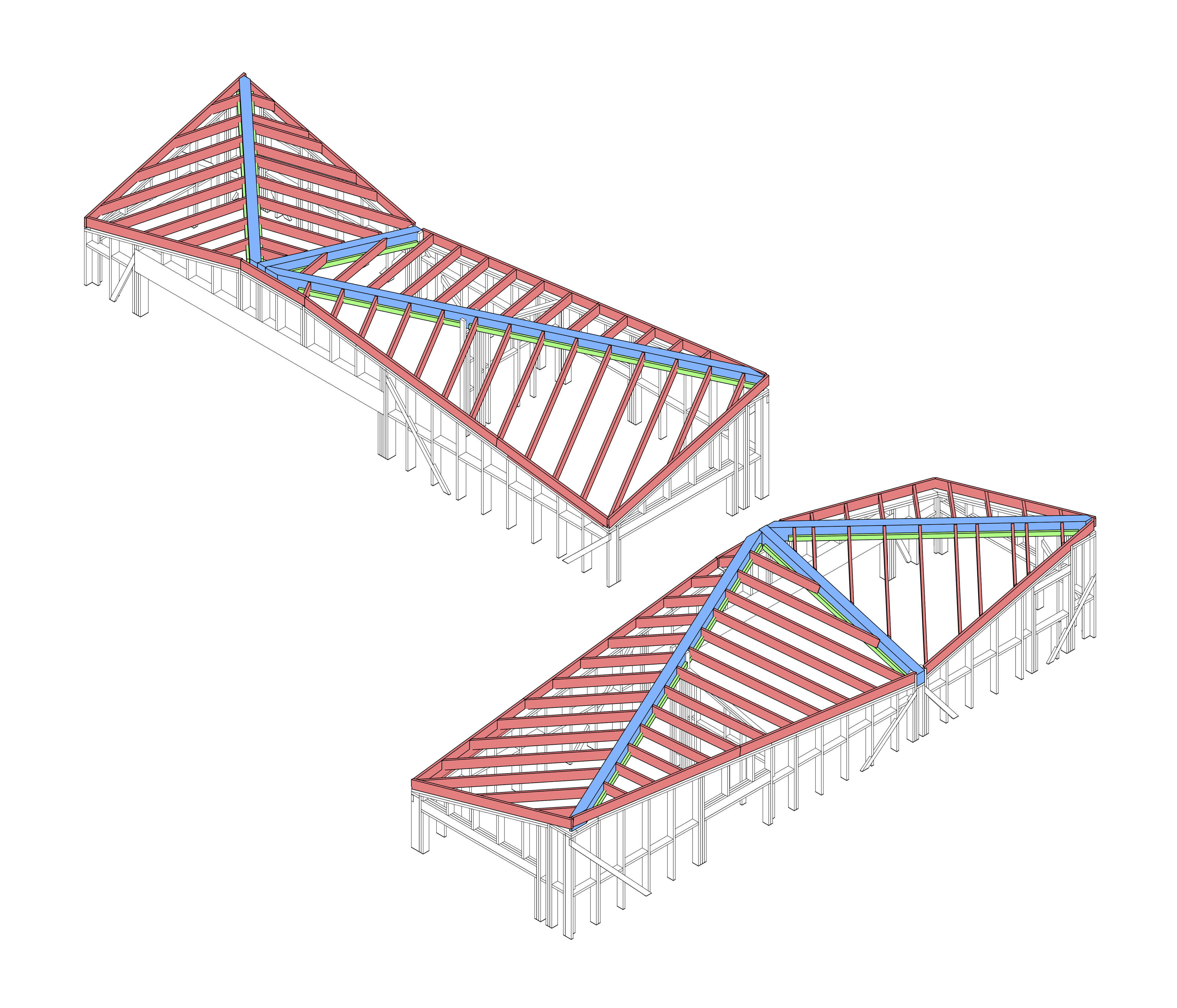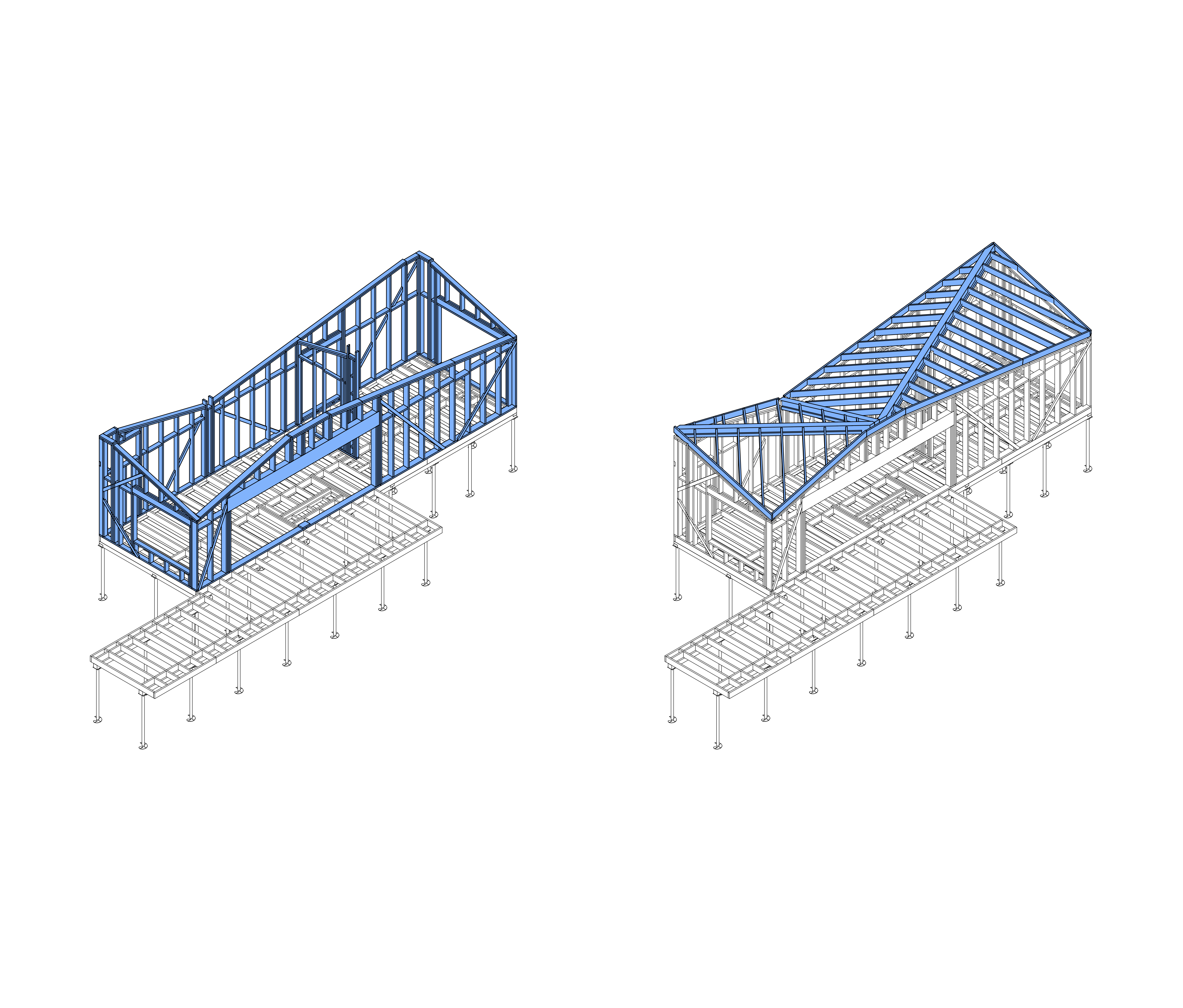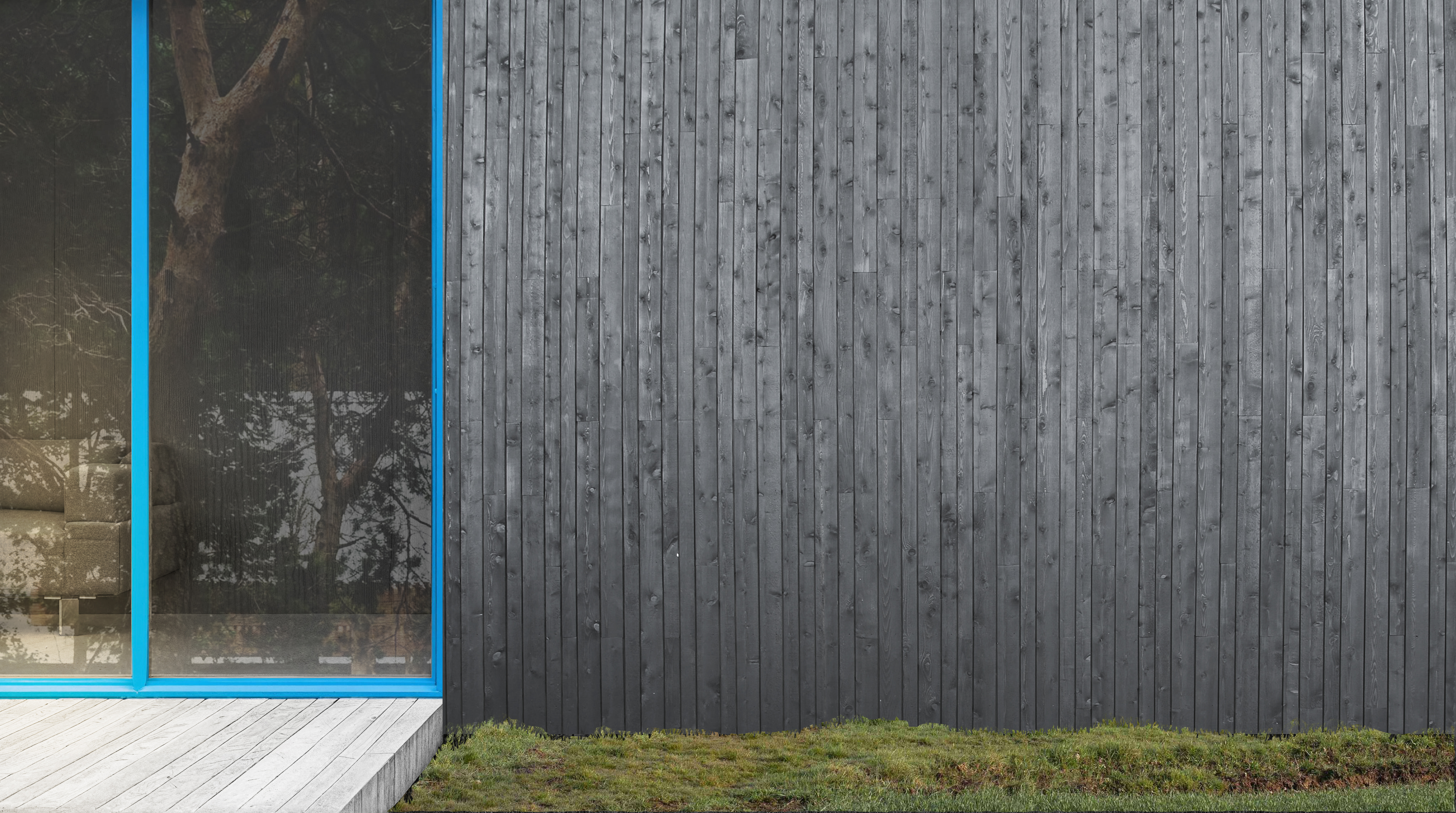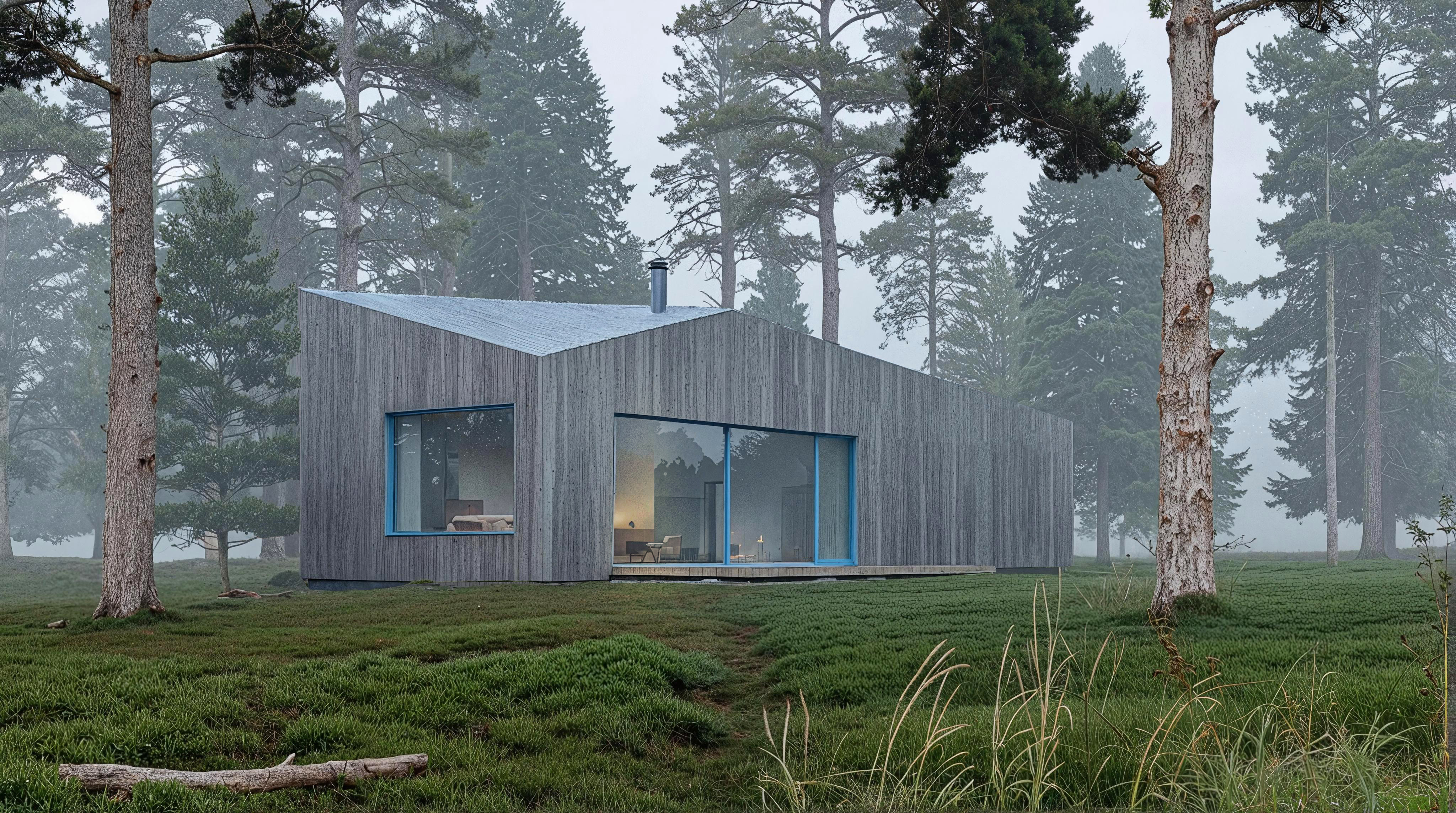 Житловий будинок, що розташований серед соснового лісу на Волині, продовжує традицію українського просторового мислення: він пропонує нову форму, що сучасна та водночас вкорінена в місце. Проєкт оперує простими об’ємами, монохромною дерев’яною оболонкою та делікатною інтеграцією в ландшафт.Форма будинку — пряма відповідь на топографію ділянки та характер дерев довкола. Гострий силует даху резонує з профілем лісу, а фасад із натуральної деревини з часом сіріє, аби врешті злитися чи то з туманом, чи стовбурами сосен.Окремим жестом виступають віконні рами, пофарбовані в інтенсивний синій колір. Цей мотив навіяно традиційною архітектурою Полісся, де вікна почасти мали сині лиштви, себто кольору, що вважався оберегом. Тут ця деталь не наслідує, а трансформує — вбудовує культурний код у сучасну структуру.Інтер'єр максимально відкритий до пейзажу. Панорамні вікна надають простору прозорості, і дозволяють лісу бути повноцінним елементом життєвого довкілля. Водночас, архітектура зберігає інтимність і вибудовує тишу всередині.Цей будинок — не спроба повернутися до традицій у буквальному сенсі. Це — спроба виявити те, що залишилося глибоко в українській архітектурній пам’яті, і дати цьому нову форму, актуальну нині.